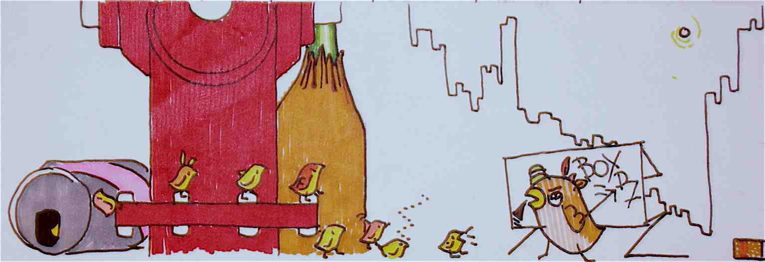 So I had some paper there and I drew a little grumpy bird with a cigar and some scraggly feathers. Wouldn’t it be funny, I thought, if he had a bunch of little baby birds following him around? Wouldn’t it be funny if he was a tough single father bird, learning up his little chicks in the ways of city life? Now you can decide for yourself!: