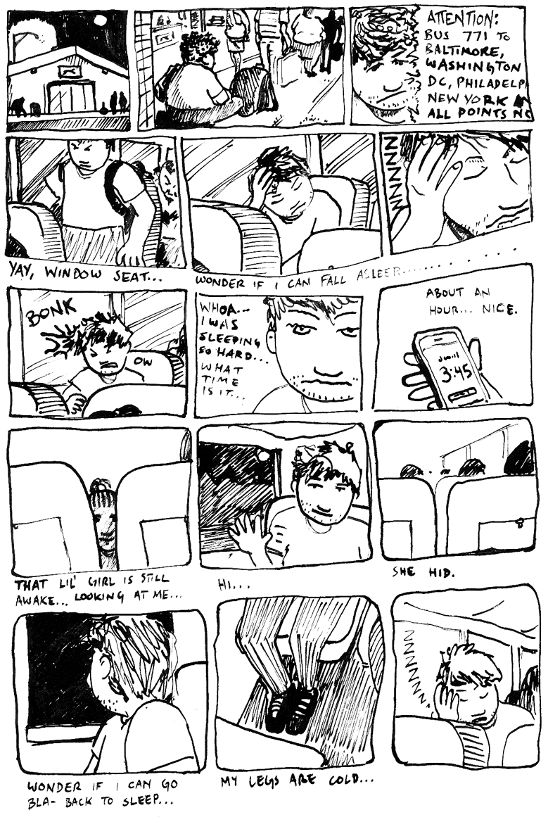 Third to last panel is the quintessential greyhound panel, all panels: great. I could write an encyclopedia on \” bus sleeping positions: their advantages and disadvantages\”