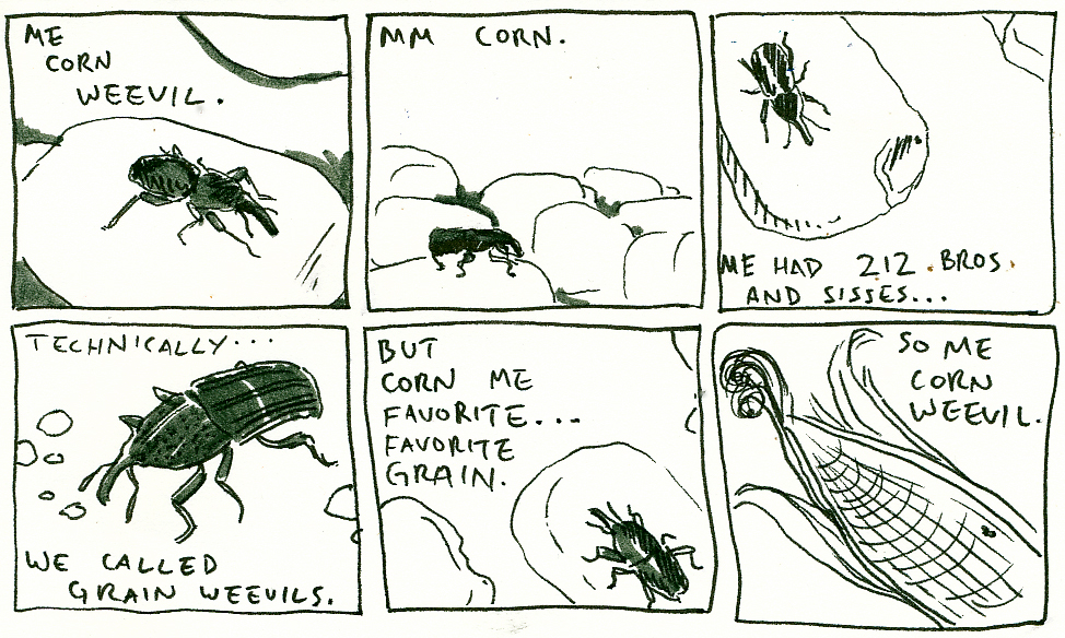 2. Freaking bugs. Always with the bugs. Nasty dang weevils. Yes, the drawing is great, but that only makes it worse. I can picture those nasty, little weevils on my corn. I'll never eat corn again. Nasty!