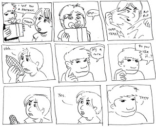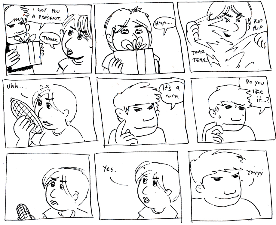 Lolo B-Day Comic (actually her birthday was technically yesterday) Posted bythomasokeefeJune 17, 2013Posted inUncategorizedTags:birthday, corn, laura, present, yay Share this: Click to share on X (Opens in new window) X Click to share on Facebook (Opens in new window) Facebook Like Loading... Related