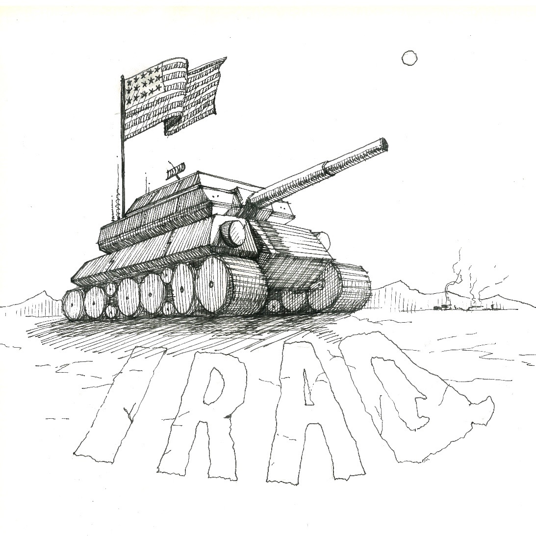 1. The tank is weighty and architectural. It feels more permanent than a vehicle. More like a slow moving building or more appropriately like a Trojan Horse. And, of course, our invasion to \”liberate\” Iraq was exactly like the Trojan Horse. The little circle that represents the sun floating by itself in the upper right looks hopeless as though it's making it's last feeble attempt to cast light before being blotted out by clouds of smoke. Nice work.