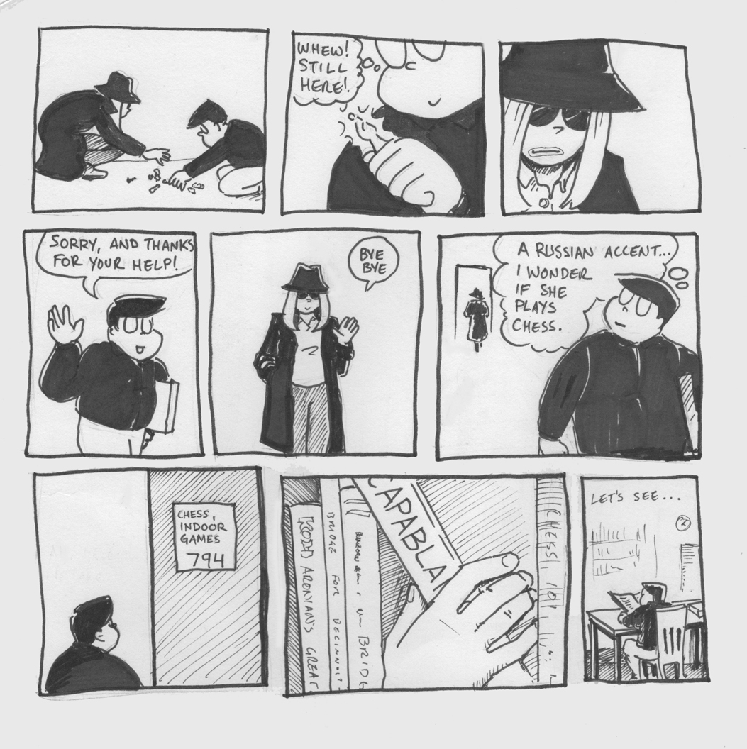 How is panel 7 like Hitchcock? Tom- Did I tell you about my amazing research day at the public library recently? Love the use of public institutions in Chess Boy.