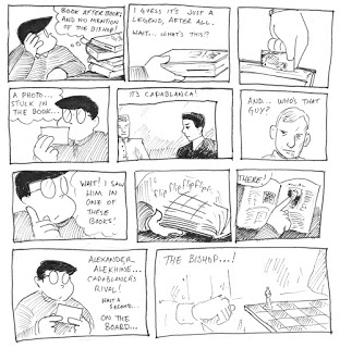 Something's up with this town – Casablanca's golden bishop in the thrift store… a photo of Casablanca, WITH the golden bishop, stuck in a book in the public library… its as though chess boy's strange obsession with chess is summoning forth a chess reality all around him. In that way, this is realistic – obsessions do tend to make this kind of thing happen, or so it seems………….