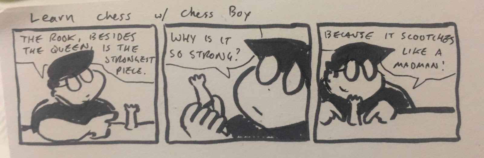 1. I’ve just been catching up on chess boy. I appreciate the continuous story of the Golden Bishop, but this classic proto-chessboy: just a kid excited about chess for no reason – is pretty great too.