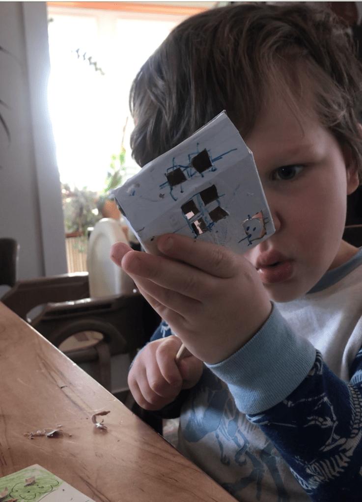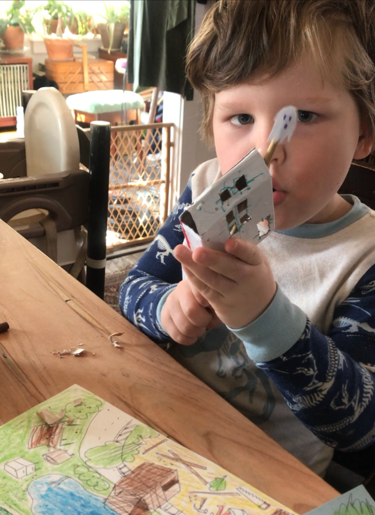 The other day, Cyrus wanted to paint with house paint. So we made some little box houses out of old crayon boxes and macaroni boxes. When the paint dried, he drew windows and doors on the box, and I cut them out, to make a spooky house. Then we made a couple of little paper ghosts and glued them to sticks so that you can haunt the house.